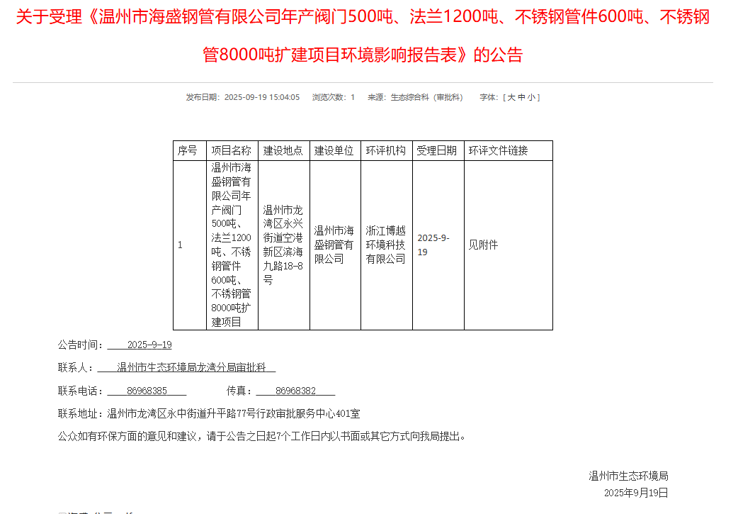 2025年9月19日,溫州市生態(tài)環(huán)境局受理溫州市海盛鋼管有限公司年產(chǎn)閥門500噸、法蘭1200噸、不銹鋼管件600噸、不銹鋼管8000噸擴建項目環(huán)境影響報告表并對外進行公告,公告期:7個工作日。