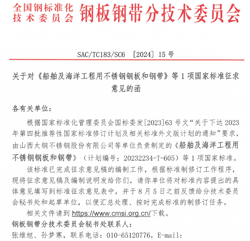 6月5日,由山西太鋼不銹鋼股份有限公司等單位負(fù)責(zé)制定的國(guó)家標(biāo)準(zhǔn)《船舶及海洋工程用不銹鋼鋼板和鋼帶》已完成征求意見(jiàn)稿的編制工作。